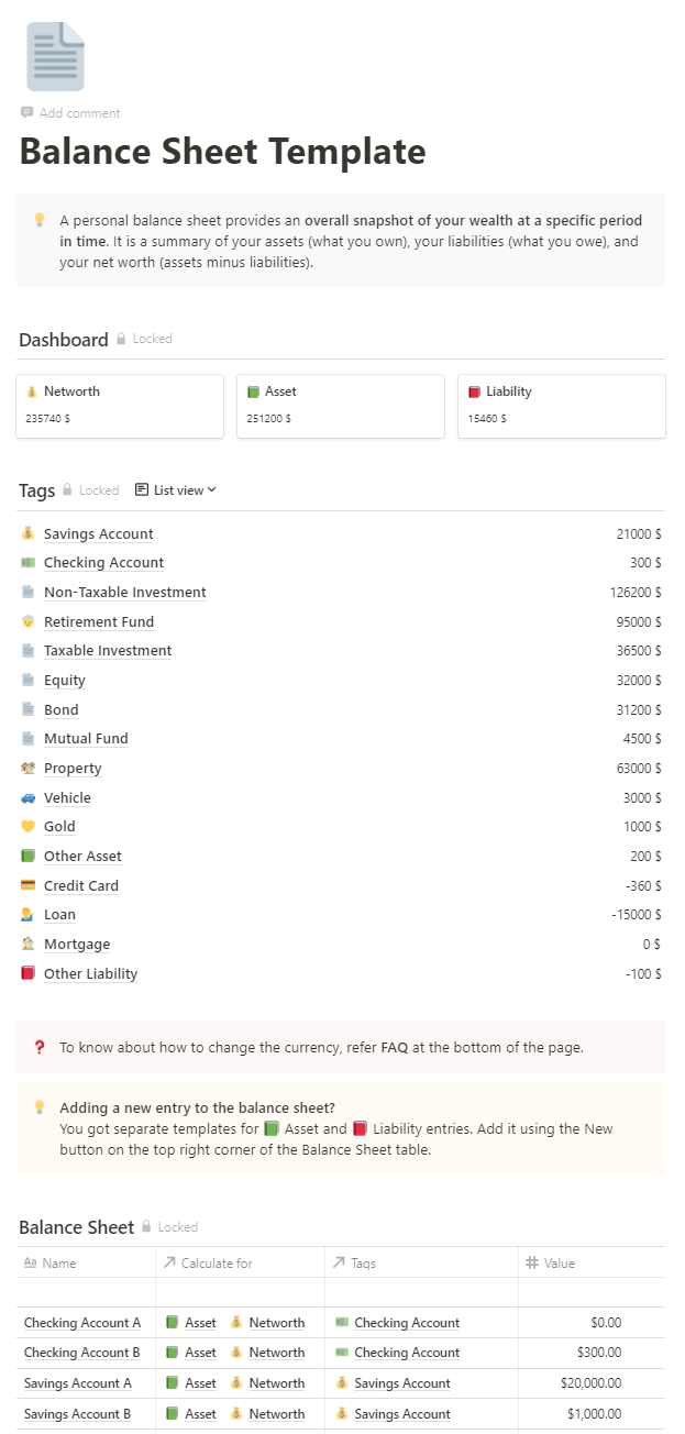 A simple Notion template for your Balance Sheet. You can add multiple, customized assets and liabilities and track your net worth and total value of the assets and liabilities by different tags.